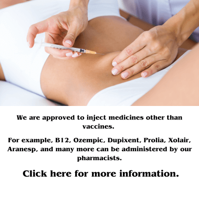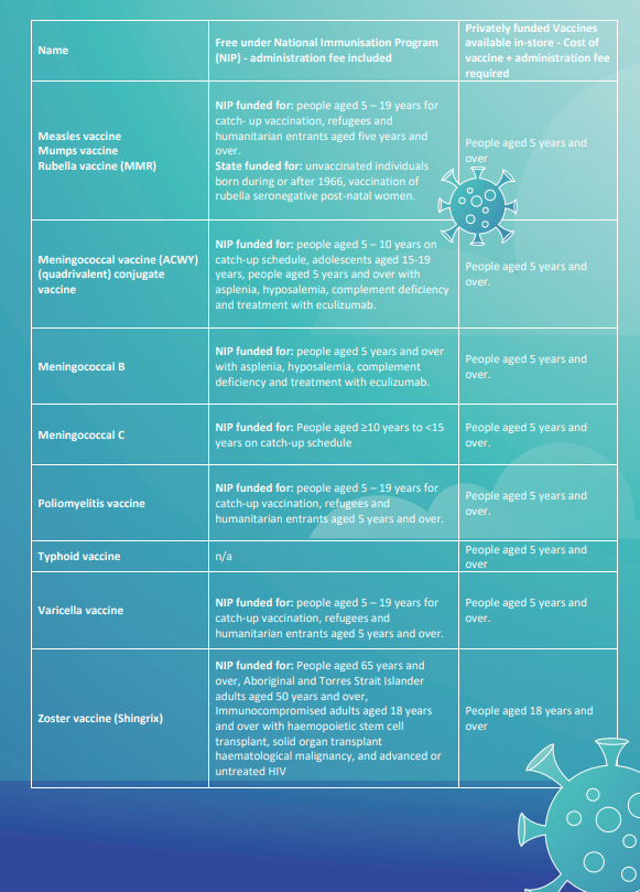 The following vaccinations can be given by our pharmacists without a prescription from your GP. If you are eligible for NIP, your vaccination will be bulk billed, and there is nothing to pay. See the below table for details. If you are not eligible for NIP, there is a charge of $15 per vaccine for administration plus the cost of the vaccine. We are also accredited to administer "Medications by Injections" for scheduled and unscheduled medicines such as B12, Ozempic, Prolia, Dupixent, etc.