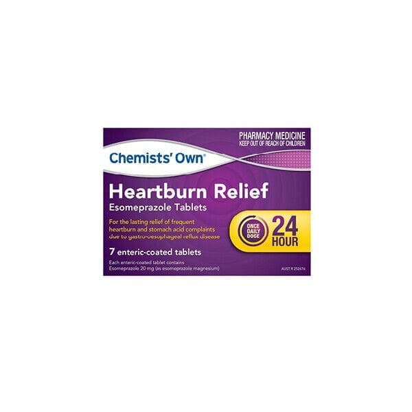 • Chemists Own Heartburn Relief Esomeprazole 20 mg the lasting relief of frequent heartburn and stomach acid complaints due to gastro-oesophageal reflux disease.
