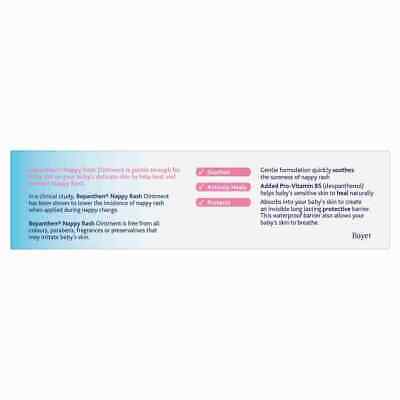 Bepanthen Nappy Rash ointment has a unique dual action to help treat and prevent nappy rash whilst providing a soothing relief for your baby. Bepanthen Nappy Rash is specifically formulated for baby’s delicate skin. Bepanthen Nappy Rash ointment helps protect against nappy rash and keeps the baby’s skin hydrated whilst providing a long lasting breathable waterproof barrier. It also contains Provitamin B5 (dexpanthenol) which acts to repair baby’s skin. If your baby has nappy rash, Bepanthen Nappy Rash’s gentle formulation quickly soothes the soreness and aids natural skin healing Free from all colours, fragrances and preservatives, so it’s the gentle choice to help treat and prevent baby’s nappy rash. A clinical study1 has shown that using Bepanthen® Nappy Rash to help protect baby’s skin at every nappy change leads to a lower incidence of nappy rash.