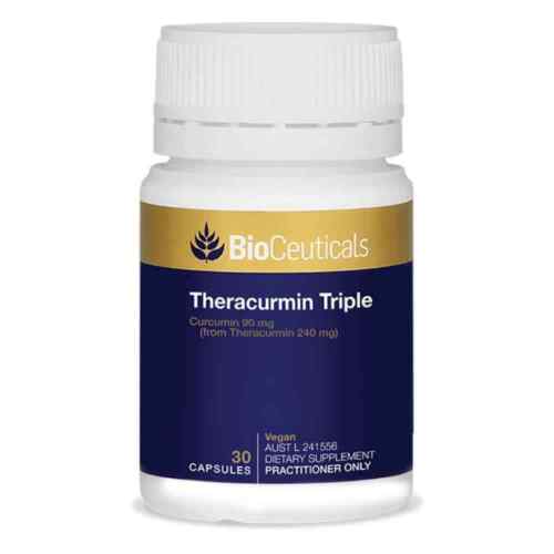 BioCeuticals Theracurmin Triple is a high dose, highly bioavailable form of curcumin. One capsule contains a formulated form of curcumin, Theracurmin, providing the bioequivalence of 2430mg of common, unformulated curcumin. Curcumin has demonstrated antioxidant and anti-inflammatory properties. Theracurmin Triple aids in relieving the symptoms of mild osteoarthritis including decreasing mild joint pain and swelling. Theracurmin also supports gallbladder function.