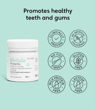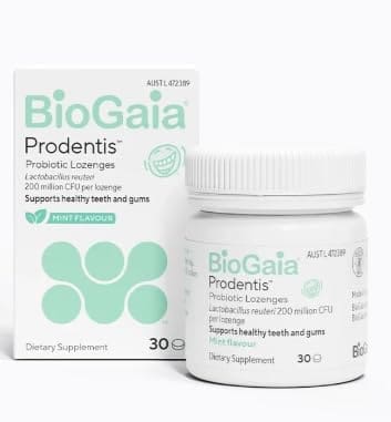 BioGaia Prodentis lozenges is a daily oral probiotic to support healthy gums and teeth. Each minty fresh lozenge features two patented bacterial strains that support a balanced oral microbiota. When combined with regular brushing and flossing, BioGaia Prodentis provides a comprehensive and easy support for oral hygiene.