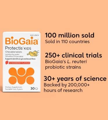 BioGaia Protectis Tablets for Kids is a dietary supplement scientifically formulated for children and teens. Non-GMO, each probiotic chewable for kids delivers 100 million live L. reuteri (DSM 17938) to help maintain gut balance. Shown to be suitable from age 3 years +, it’s the perfect dose of lactobacillus reuteri for kids in every chewable tablet.