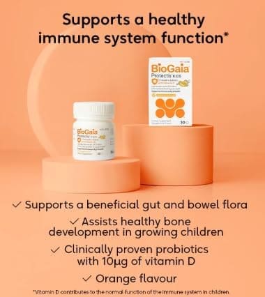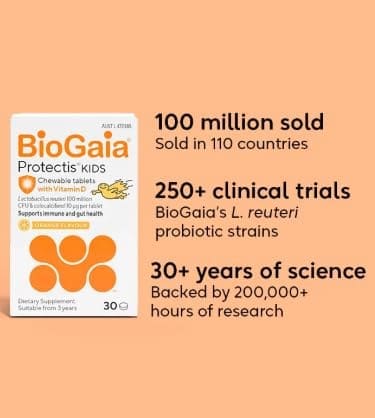 BioGaia Protectis Tablets for Kids is a probiotic for digestive health and maintenance of immune system. Non-GMO, each probiotic chewable for kids delivers 100 million live L. reuteri to help maintain gut balance. Scientifically formulated for children aged 3 years+, it’s the perfect dose of lactobacillus reuteri + Vitamin D for kids in every chewable tablet.