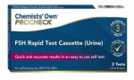 The Chemist’s Own PROCHECK rapid test is for the detection of increased Follicle-Stimulating Hormone (FSH) in a urine sample to aid in the detection of the onset of menopause. This test cannot determine fertility. It is advised to continue using contraception until the menopause status has been confirmed by a doctor.
