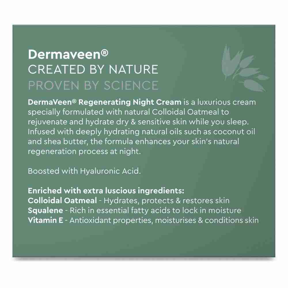 • DermaVeen Regenerating Night Cream is a luxurious cream specially formulated with natural Colloidal Oatmeal to rejuvenate and hydrate dry & sensitive skin while you sleep.