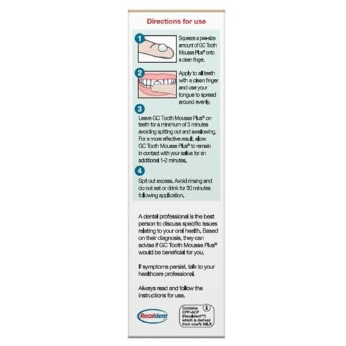 Apply a small amount of Tooth Mousse Plus to a clean finger, toothbrush, or applicator. Spread evenly over the tooth surfaces. Allow it to remain on the teeth for at least 3-5 minutes before rinsing. For best results, use as directed by your dental professional.