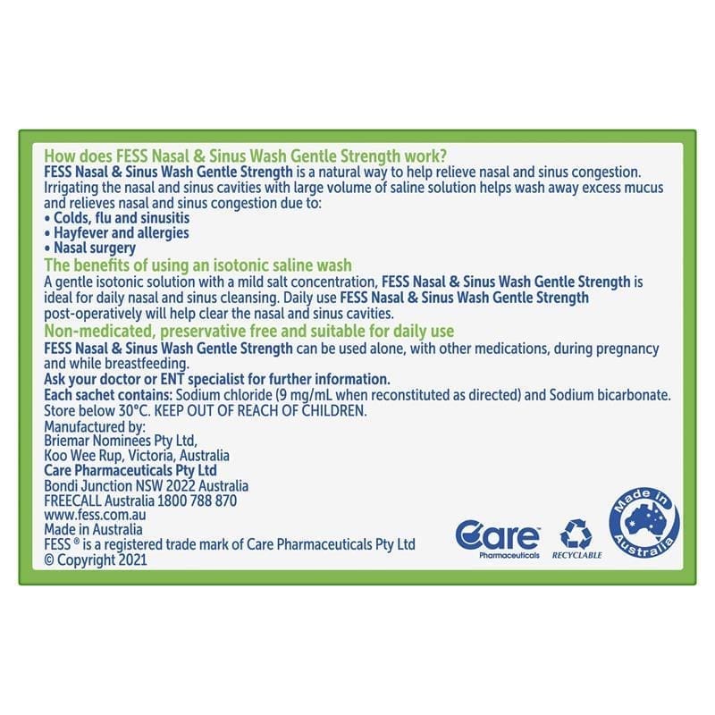• Allow half the solution to wash through the nasal passages and sinus cavity and come out of the left nostril. Using the remaining solution, repeat this process in the left nostril. A small amount of the solution may enter your throat. This is not harmful. If necessary, blow your nose when you have finished. Discard any remaining solution you do not intend using within the next 2 hours. Wash the bottle cap, and tube thoroughly after each use and allow to drip dry. For best results use Fess nasal and Sinus Wash Gentle Strength once or twice daily or as directed by your doctor or ENT specialist.USAGE ADVICE