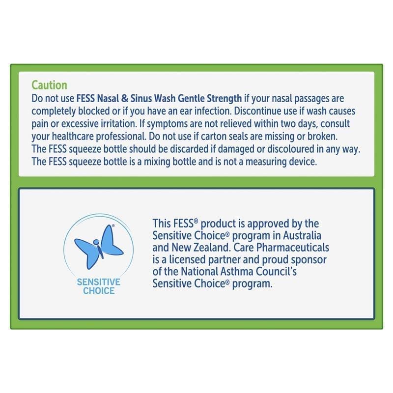 • Caution: Do not use Fess Nasal & Sinus Wash Gentle Strength if your nasal passages are completely blocked or if you have an ear infection. Discontinue use if wash causes pain or excessive irritation. If symptoms are not relieved within 2 days, consult your healthcare professional. Do not use if carton seals are missing or broken.