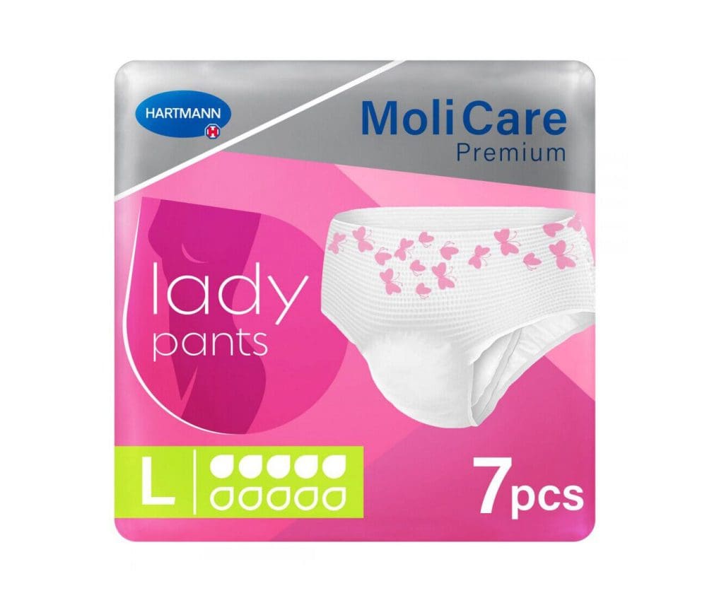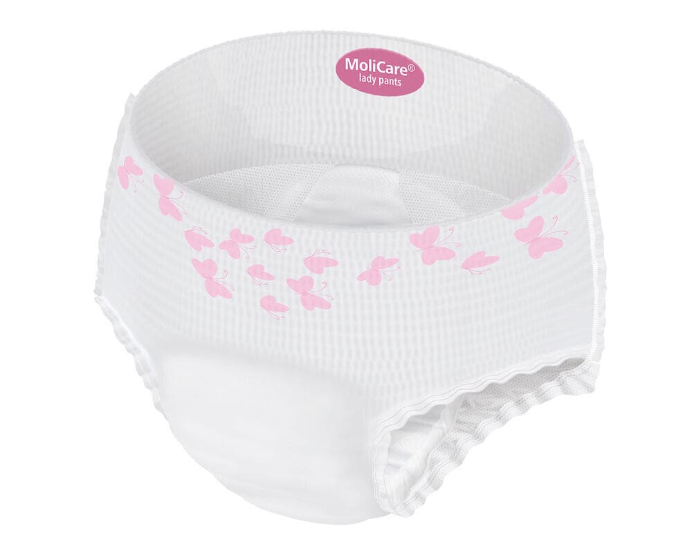 • MoliCare Premium Lady Pants 5 Drops Large look and feel like regular underwear and are ideal for light to moderate levels of bladder weakness. The pants contain skin friendly Aloe Vera as well as a 3-layer absorbent core that pulls fluid away from the surface, so the skin stays dry, healthy and free from odours. It also has unique curly fibre technology that helps to maintain the skin’s natural pH level and is important in reducing infection and skin irritation caused by incontinence.