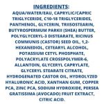 Aqua/water/eau, Caprylic/capric Triglyceride, C10-18 Triglycerides, Panthenol, Glycerin, Triisostearin, Butyrospermum Parkii (Shea) Butter, Polyglyceryl-3 Distearate, Ricinus Communis (Castor) Seed Oil, 1,2-hexanediol, Cetearyl Alcohol, Potassium Cetyl Phosphate, Polyacrylate Crosspolymer-6, Allantoin, Glyceryl Caprylate, Glyceryl Stearate Citrate, Hydrogenated Castor Oil, Hydrolyzed Hyaluronic Acid, Xanthan Gum, Copper Pca, Zinc Pca, Sodium Hydroxide, Persea Gratissima (Avocado) Fruit Extract, Citric Acid