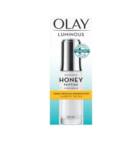 OLAY Luminous Niacinamide Honey Peptide Super Serum visibly Reduces Sun Pigmentation for a Healthy Glow. It is Dermatologically Proven that 87%^ Showed Reduction In Visible Pigmentation Caused By The Sun ^Based on dermatologists rating after 8 weeks in a consumer study, 2021
