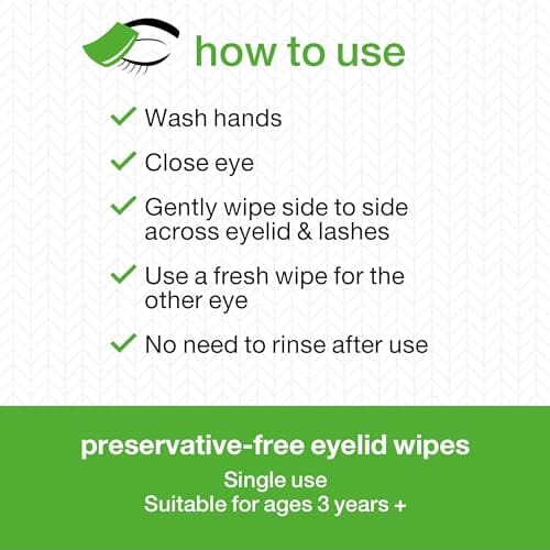 Wash hands before use. Close your eye and wipe gently and thoroughly across the eyelid and lashes several times in a side to side motion. Using a fresh wipe, repeat the process for the other eye.