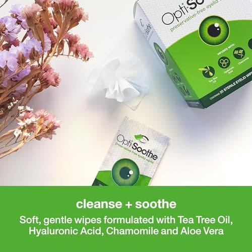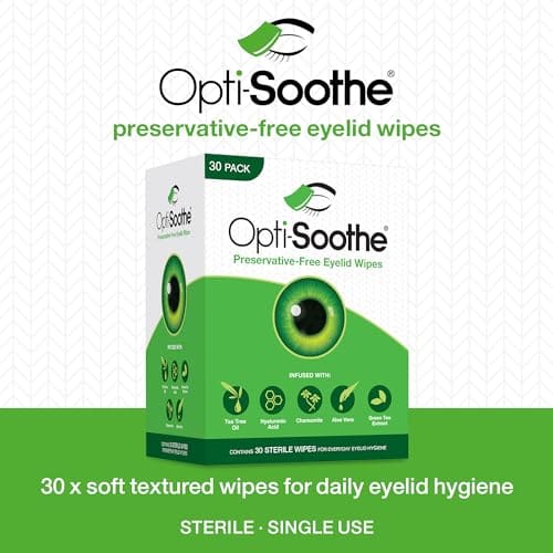Opti-Soothe Preservative-free Eyelid Wipes are infused with Tea-Tree Oil, Hyaluronic Acid, Chamomile and Aloe Vera for daily eye hygiene.