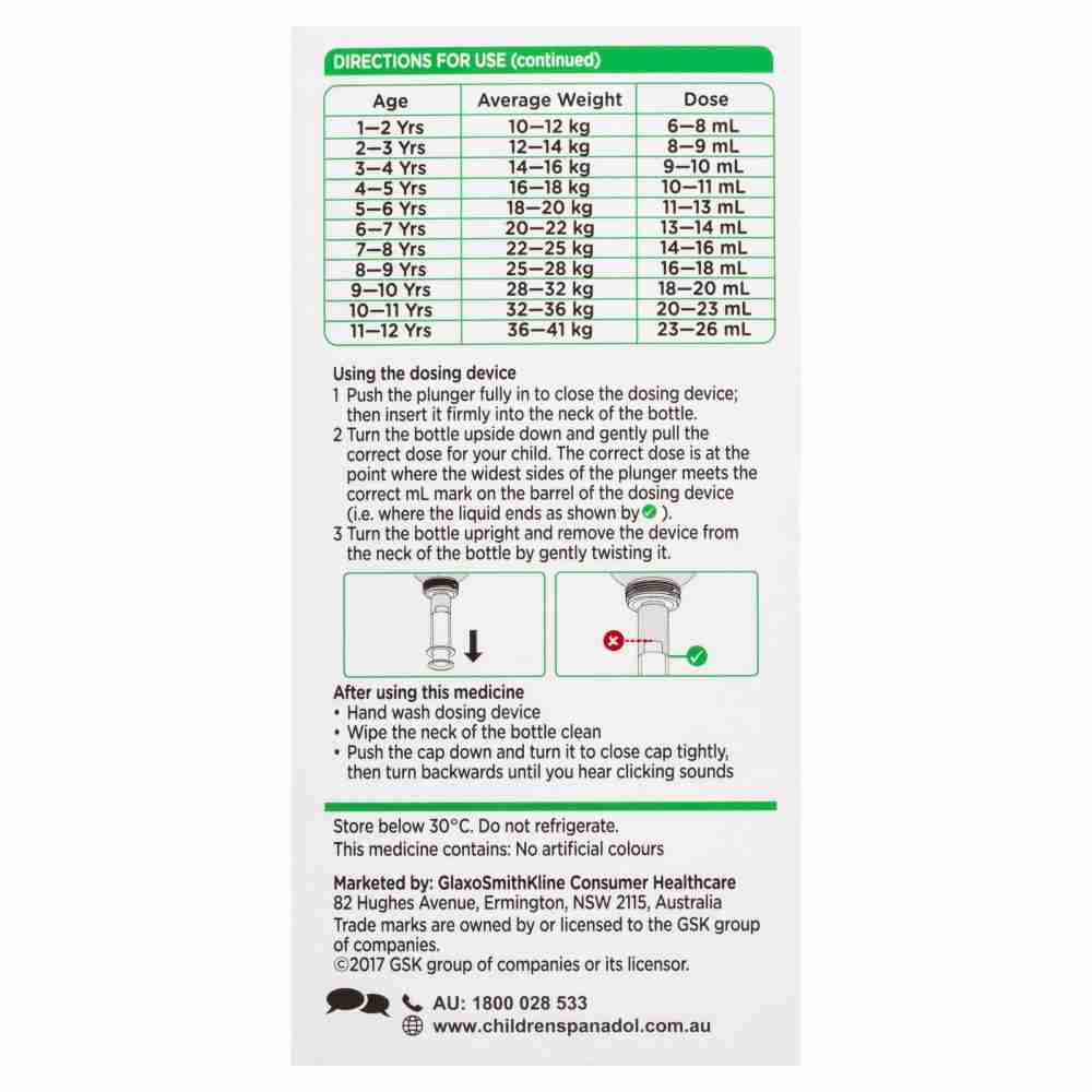 Directions for use: n- Shake the bottle well n- Use the dosing device provided to accurately measure n- Measure the correct dose based on the dosage tablen- Calculate correct dose based on child’s weight. If weight is unknown, use the child’s age. n- Repeat 4-6 hourly if required (maximum 4 times within 24 hours) n- Can be given with water or fruit juice if preferred by your child nnDosage:nAge: 1-2 Yrs, Average Weight: 10-12 kg, Dose: 6-8 mLnAge: 2-3 Yrs, Average Weight: 12-14 kg, Dose: 8-9 mLnAge: 3-4 Yrs, Average Weight: 14-16 kg, Dose: 9-10 mLnAge: 4-5 Yrs, Average Weight: 16-18 kg, Dose: 10-11 mLnAge: 5-6 Yrs, Average Weight: 18-20 kg, Dose: 11-13 mLnAge: 6-7 Yrs, Average Weight: 20-22 kg, Dose: 13-14 mLnAge: 7-8 Yrs, Average Weight: 22-25 kg, Dose: 14-16 mLnAge: 8-9 Yrs, Average Weight: 25-28 kg, Dose: 16-18 mLnAge: 9-10 Yrs, Average Weight: 28-32 kg, Dose: 18-20 mLnAge: 10-11 Yrs, Average Weight: 32-36 kg, Dose: 20-23 mLnAge: 11-12 Yrs, Average Weight: 36-41 kg, Dose: 23-26 mL