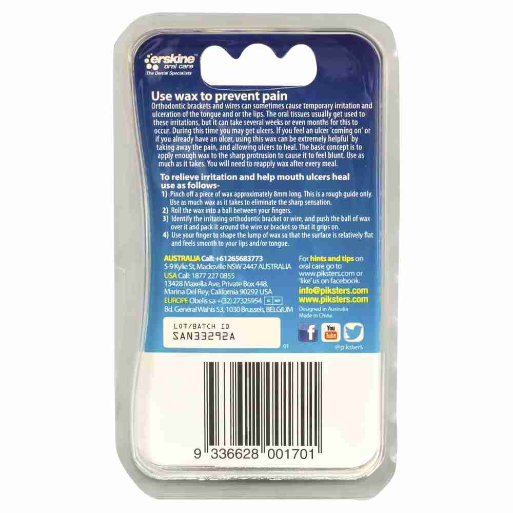 Piksters Orthodontic Wax was developed to protect against irritation, pain, and ulceration caused by orthodontic brackets and wires. Subtle Mint Flavour.
