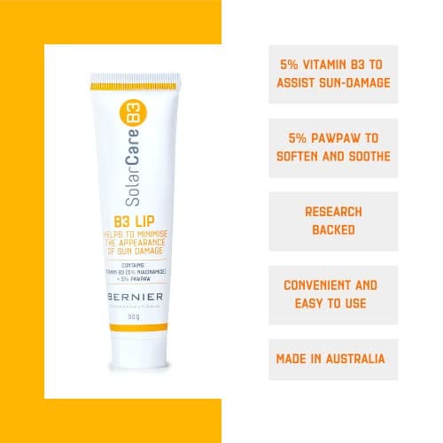 Introducing SolarCareB3 B3 Lip, a powerful lip ointment designed to target sun-damaged lips and provide comprehensive care. Developed by Australian doctors and pharmacists for the harsh Australian conditions, this product is made by Bernier Pharmaceuticals, a trusted family-owned company based in Busselton. Enriched with 5% Vitamin B3 and 5% Australian PawPaw, it soothes, softens, and moisturises sun-damaged lips. This convenient-sized tube features a pleasant scent, allowing for easy application on the go. For optimal results, use twice daily for a minimum of three months. With SolarCareB3 B3 Lip, you can trust the trusted quality and expertise behind its formulation, ensuring your lips receive the care they deserve.