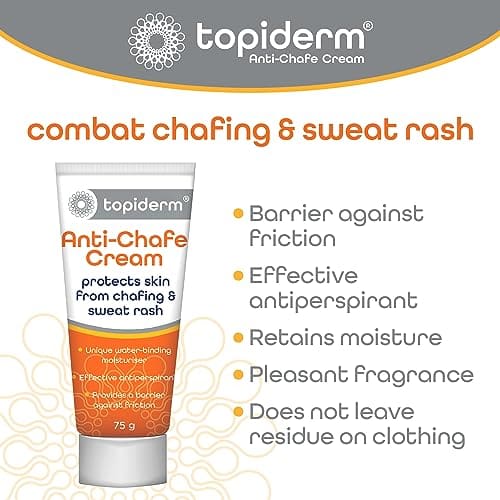 Topiderm Anti-Chafe Cream protects the skin from chafing and sweat rash.