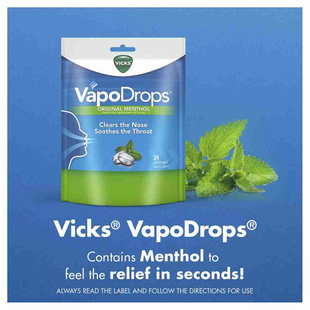 Vicks VapoDrops Original Menthol lozenges soothes the throat, clears the nose._x000D__x000D_- Vicks VapoDrops temporarily relieves sore throat and blocked nose. It soothes the throat and clears the nose._x000D_- For the throat: The proven Vicks medications soothes and cools irritated throats._x000D_- For the nose: Vicks vapour action clears and cools nasal passages – fast._x000D_- Available in 4 flavours: Original Menthol, Butter Menthol, Burst of Mint and Cooling Peppermint_x000D_- Standard sizes: 10 drops | 24 drops | 27 drops | 30 drops_x000D_- Now available in Mega Value Pack in 2 flavours – Original Menthol and Butter Menthol._x000D__x000D_Vicks VapoDrops will quickly relieve the “throat tickle” that precedes a coughing fit and could prevent you from using your voice with confidence! The lozenges will help to soothes the throat and clears the nose. Feel the effect in seconds!_x000D__x000D_Ingredients_x000D_Menthol 10.6mg. Also contains: Glucose – Liquid and Sucrose_x000D_Directions_x000D_Take 1-2 lozenges every 2-3 hours as needed.